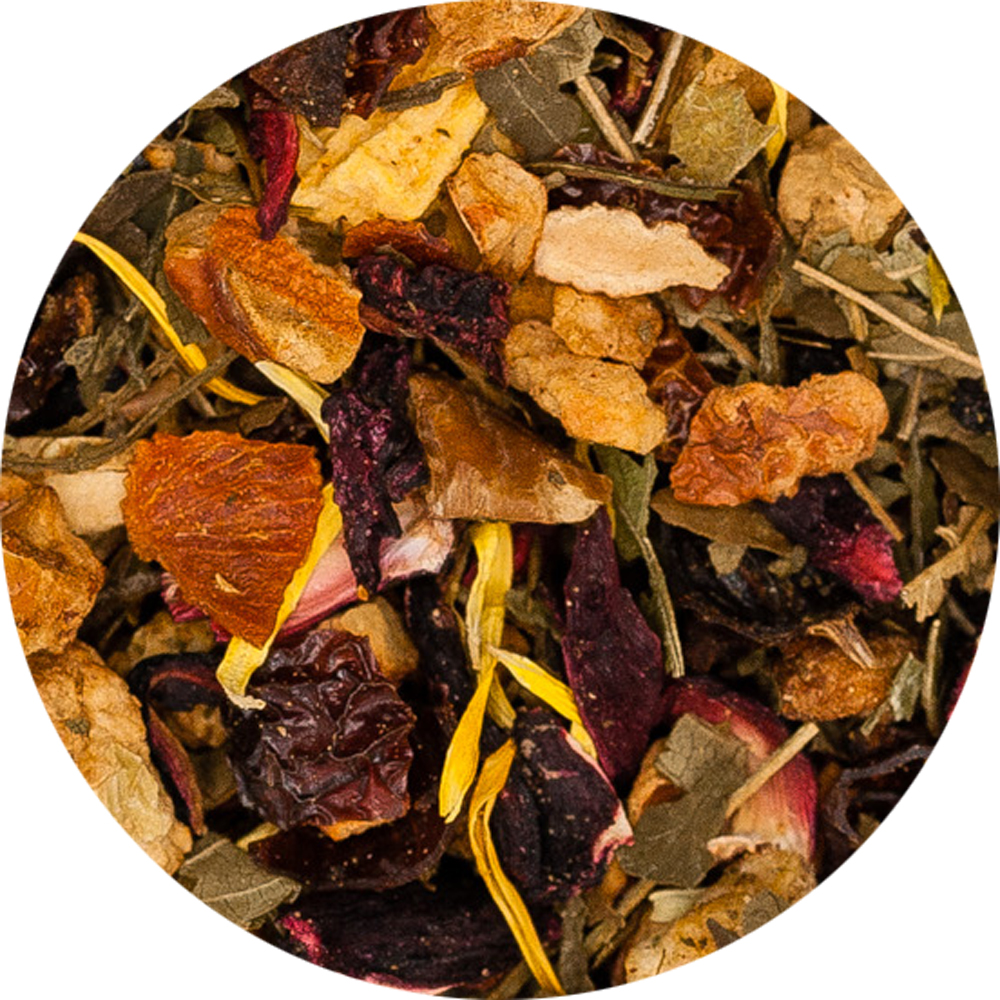 Apfelstücke*, Hagebuttenschalen*, weißer Hibiskus*, süße Brombeerblätter*, Zichorienwurzel geröstet*, Aromen, Pfirsichstücke*, Ringelblumenblüten* (* Zutaten aus kontrolliert biologischem Anbau)