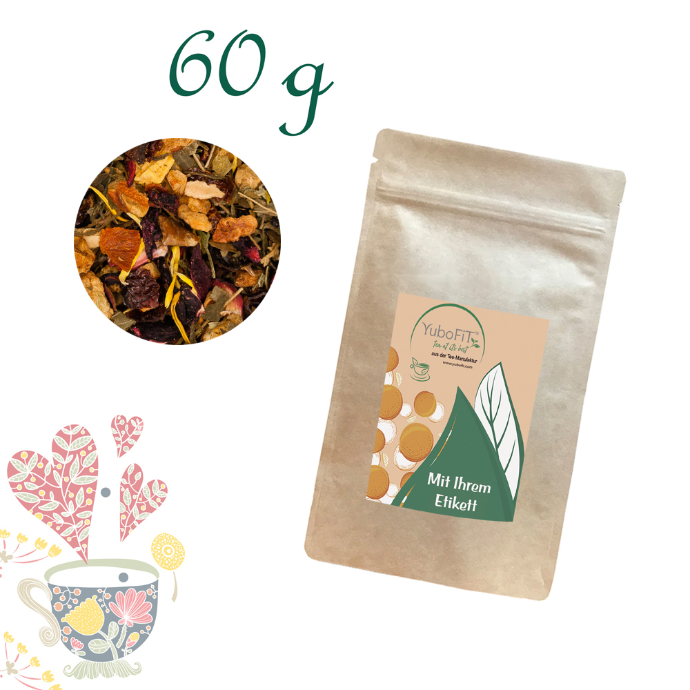 Apfelstücke*, Hagebuttenschalen*, weißer Hibiskus*, süße Brombeerblätter*, Zichorienwurzel geröstet*, Aromen, Pfirsichstücke*, Ringelblumenblüten* (* Zutaten aus kontrolliert biologischem Anbau)