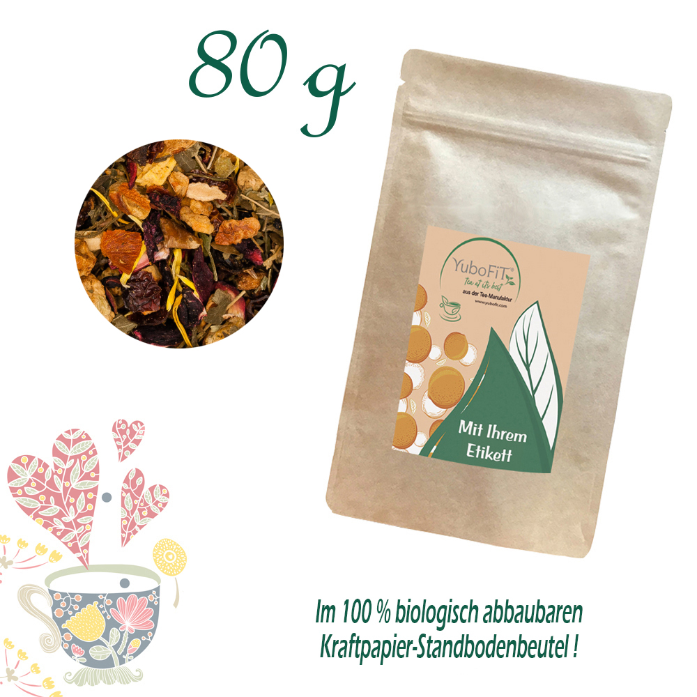 Apfelstücke*, Hagebuttenschalen*, weißer Hibiskus*, süße Brombeerblätter*, Zichorienwurzel geröstet*, Aromen, Pfirsichstücke*, Ringelblumenblüten* (* Zutaten aus kontrolliert biologischem Anbau)