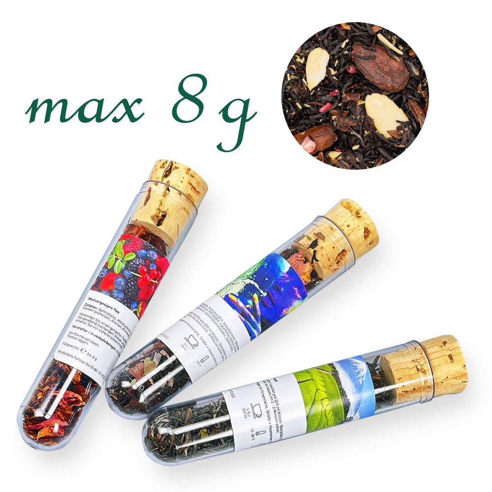 Schwarzer Tee*, Kokosnussraspeln*, Kakaobohnen*, Kakaoschalen*, Mandeln*, Aromen, Himbeeren*, Sauerkirschen* (Sauerkirsche*, Sonnenblumenöl*) (* Zutaten aus kontrolliert biologschem Anbau)