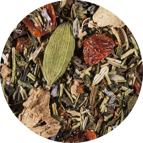 Rosmarin*, Brennnesselblätter*, Hagebuttenschalen*, Rooibos*, Lavendelblüten* (8 %), Ingwer*, Pu Erh Tee* – Tee mit spezieller Fermentation (5 %), Mate* (5 %), Fenchel*, Süßholzwurzel*, Zimt*, schwarzer Pfeffer*, Kardamomschoten*, Gewürznelken*(* Zutaten aus kontrolliert biologischem Anbau)