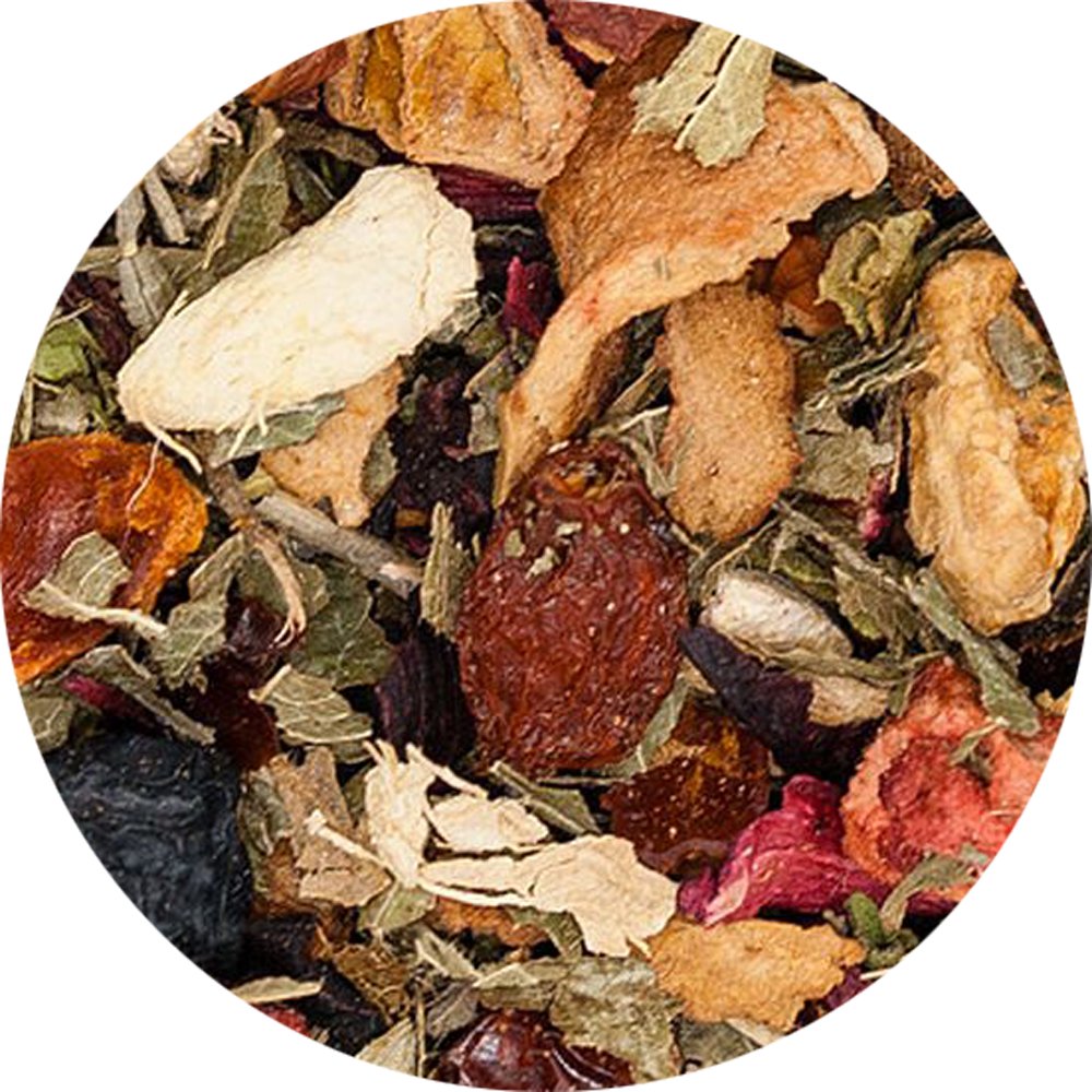 Apfel*, Ingwer* (11 %), Hagebuttenschalen*, Hibiskus*, Brombeerblätter*, Rote Bete*, Aroniabeeren* (7 %), Aromen, Steviablätter*, Gojibeeren* (1,5 %), Erdbeerstücke*(*Zutaten aus kontrolliert biologischem Anbau)