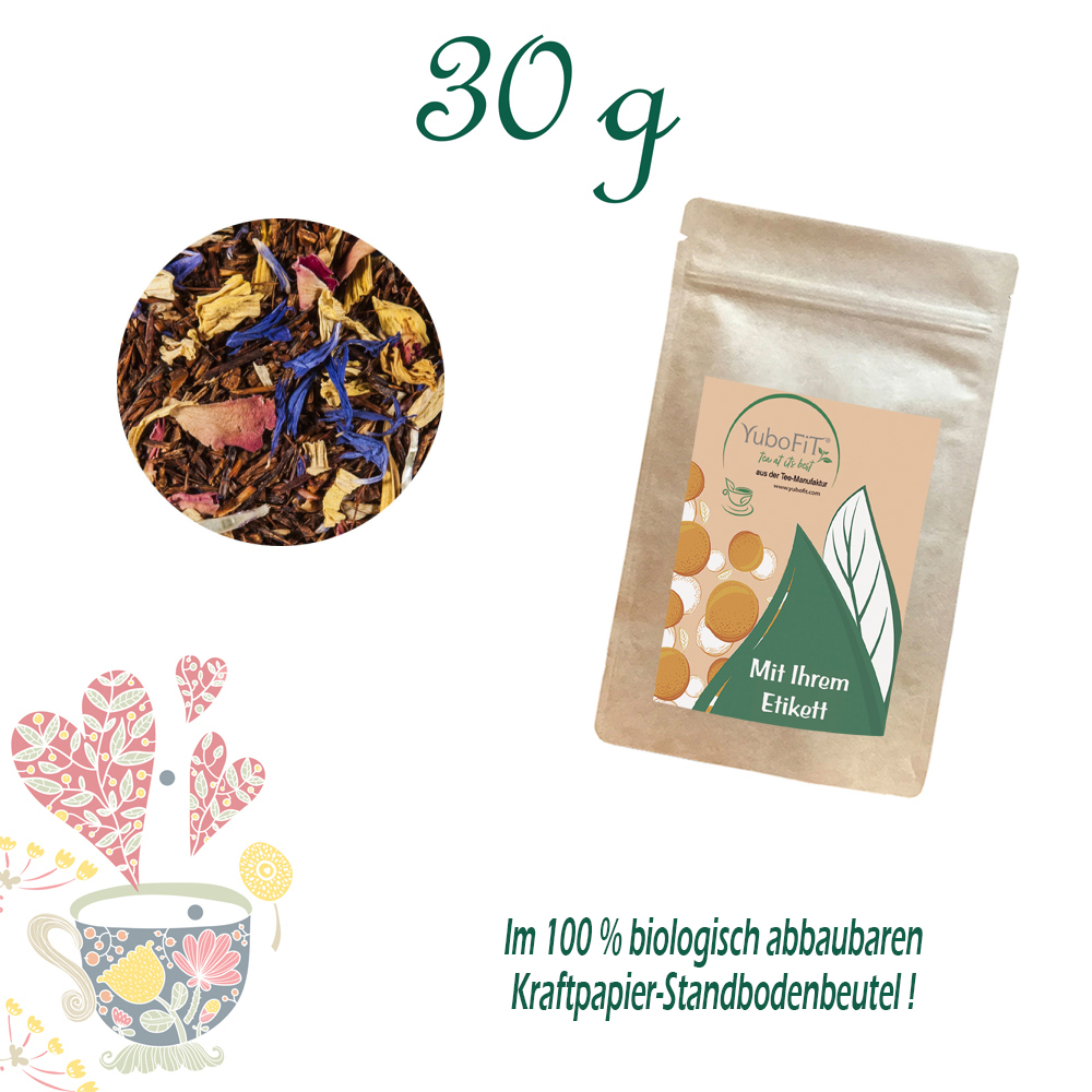 Bei dieser Komposition tanzt der Rooibos einen sanften Reigen mit bunten Blütenblättern.