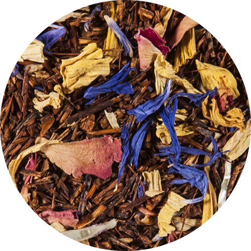 Bei dieser Komposition tanzt der Rooibos einen sanften Reigen mit bunten Blütenblättern.