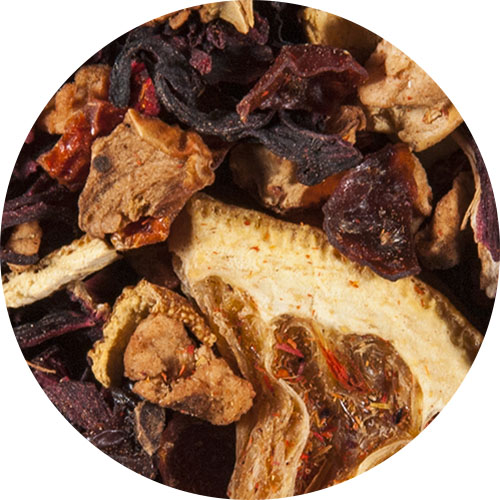 Apfelstücke, Hibiskusblüten, Hagebuttenschalen, Orangenschalen, Orangenspalten mit Schale, natürliche Orangenaromen, Färberdistelblüten