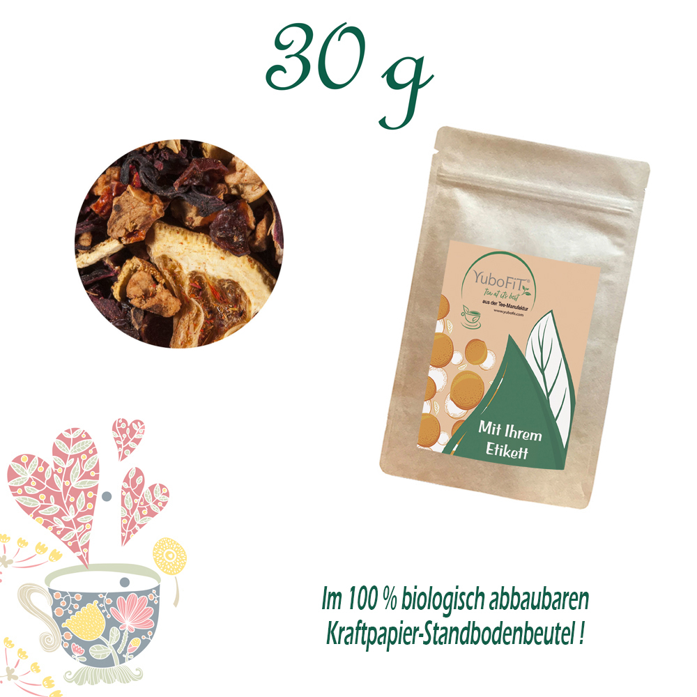 Apfelstücke, Hibiskusblüten, Hagebuttenschalen, Orangenschalen, Orangenspalten mit Schale, natürliche Orangenaromen, Färberdistelblüten