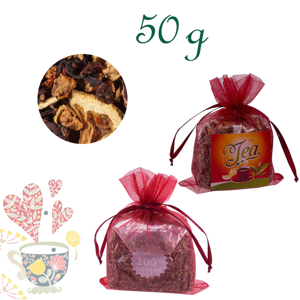 Apfelstücke, Hibiskusblüten, Hagebuttenschalen, Orangenschalen, Orangenspalten mit Schale, natürliche Orangenaromen, Färberdistelblüten