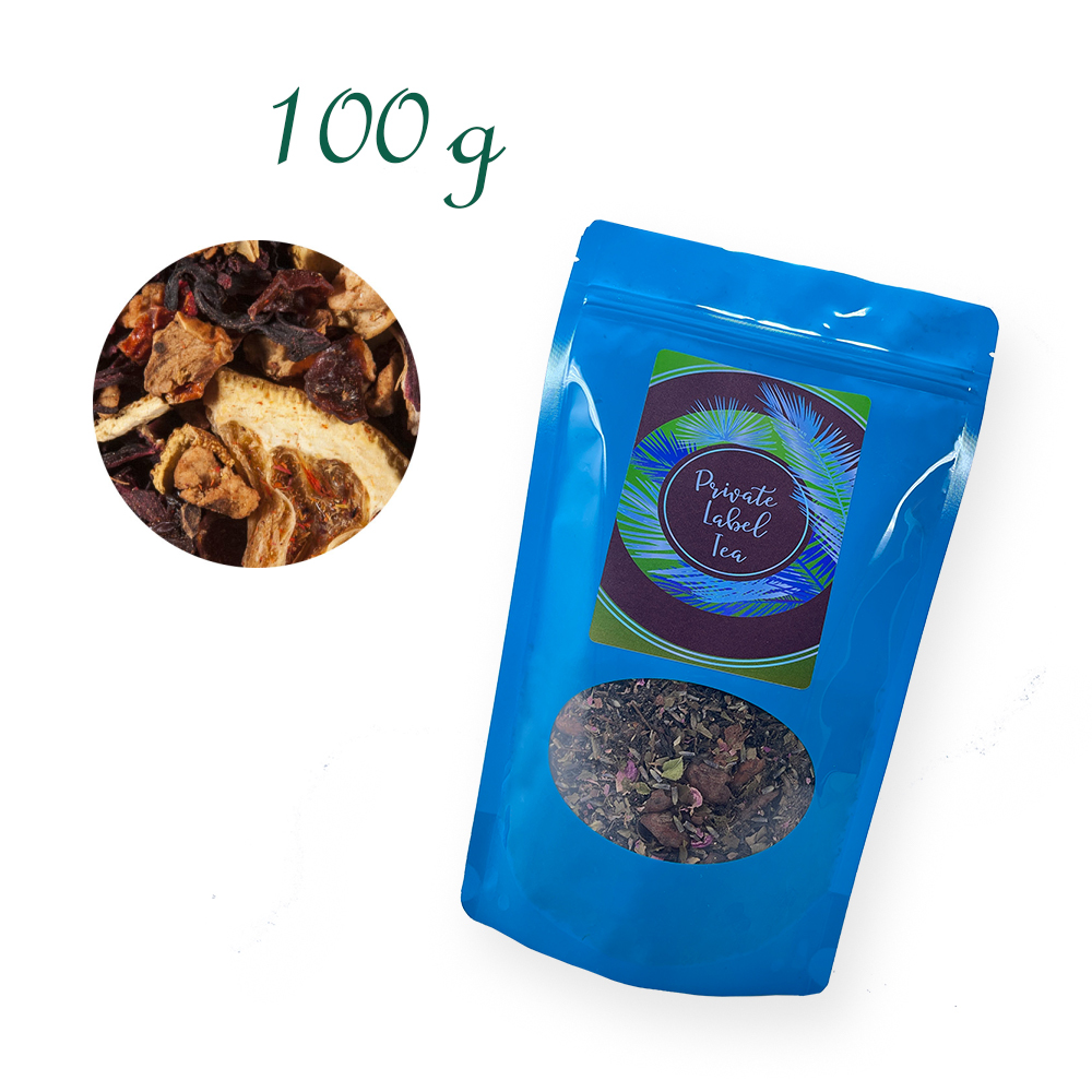Apfelstücke, Hibiskusblüten, Hagebuttenschalen, Orangenschalen, Orangenspalten mit Schale, natürliche Orangenaromen, Färberdistelblüten