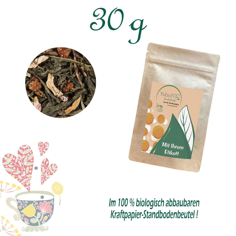 Grüner Tee China Sencha (83 %), Papayastücke (Papaya, Zucker), Aromen, Rosenblütenblätter (2 %), Erdbeerstücke