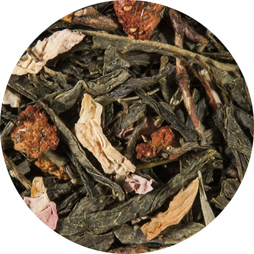 Grüner Tee China Sencha (83 %), Papayastücke (Papaya, Zucker), Aromen, Rosenblütenblätter (2 %), Erdbeerstücke