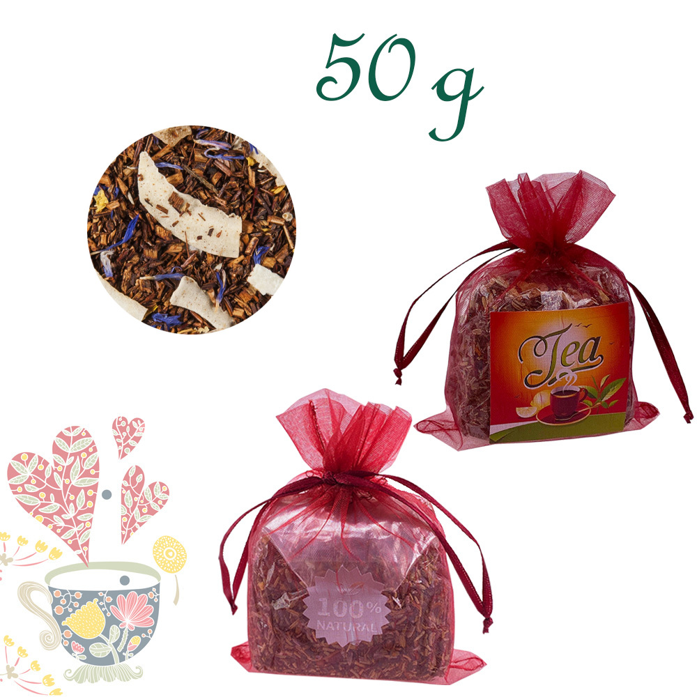 Rooibos, Ananaswürfel (Ananas, Zucker) (8 %), Kokosnusschips (6 %), Aromen, Sonnenblumenblüten, Kornblumenblüten