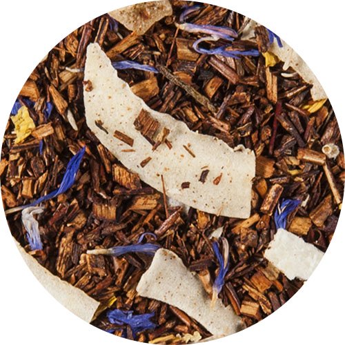 Rooibos, Ananaswürfel (Ananas, Zucker) (8 %), Kokosnusschips (6 %), Aromen, Sonnenblumenblüten, Kornblumenblüten