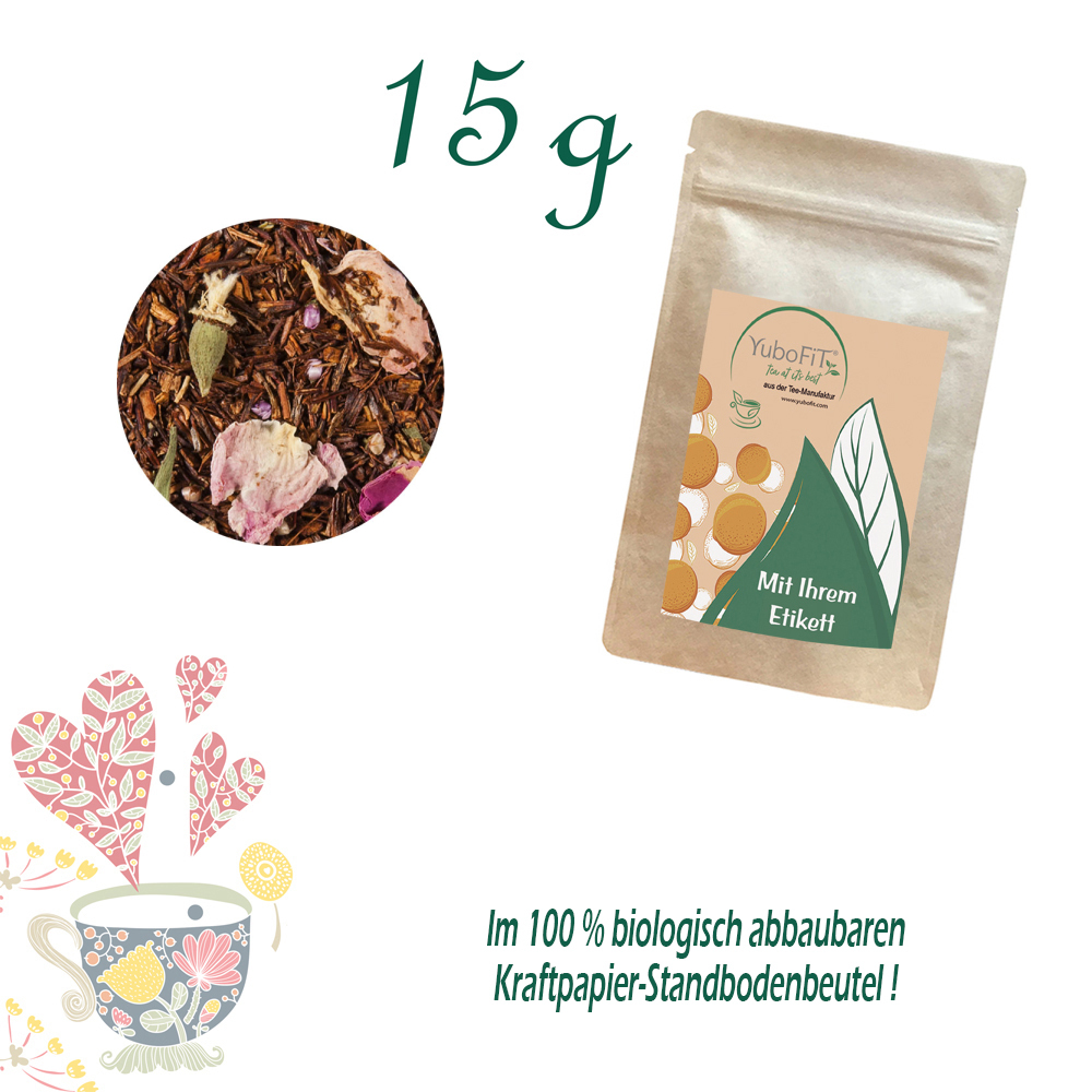 Farbige Blütenakzente machen die fruchtig-cremige Rooibos-Mischung auch zu einem Augenschmaus.