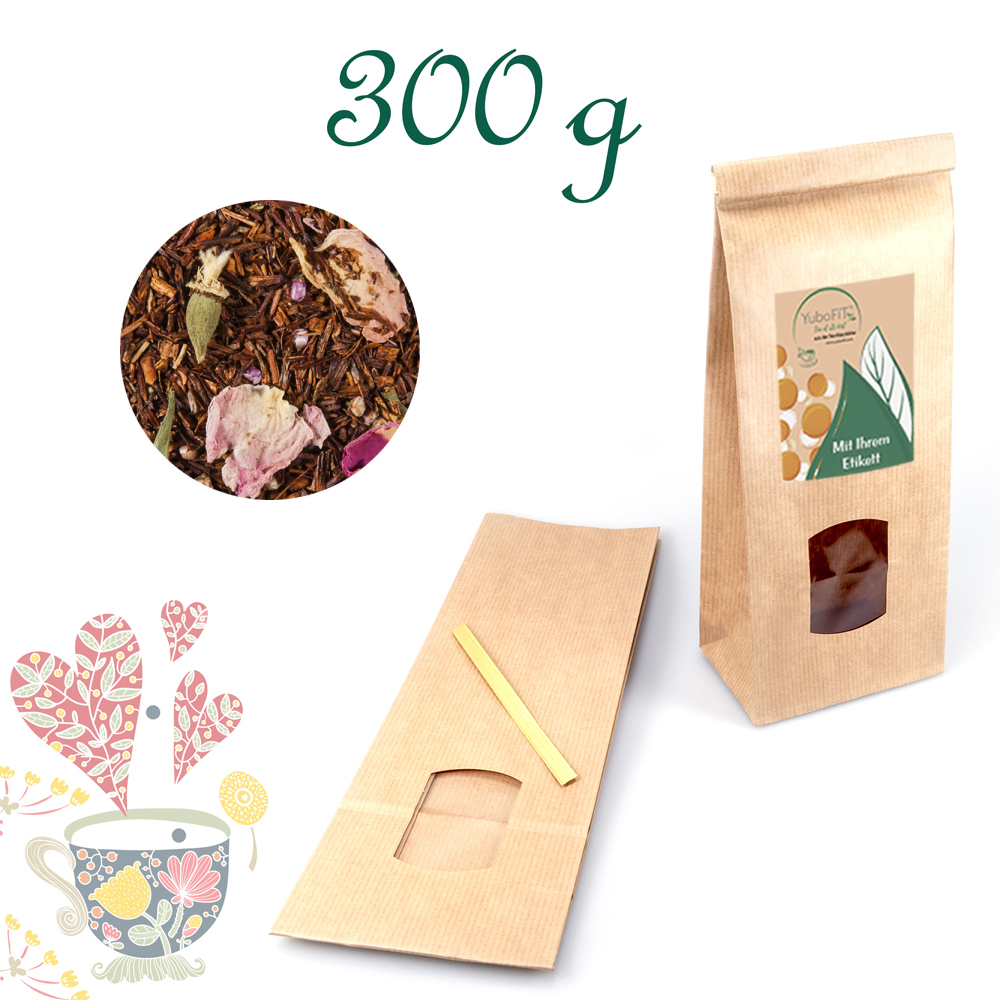 Farbige Blütenakzente machen die fruchtig-cremige Rooibos-Mischung auch zu einem Augenschmaus.
