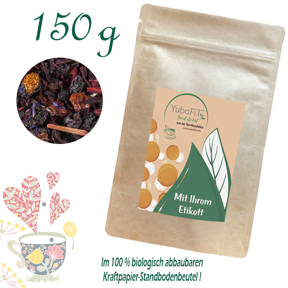 Korinthen, Hibiskusblüten, Hagebuttenschalen, Holunderbeeren, Aromen, Blaubeeren, Kornblumenblüten, Schwarze Johannisbeeren, Himbeerstücke