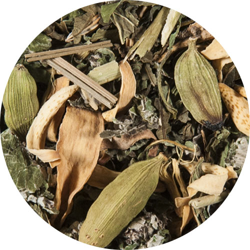 Melisse, Orangenblüten, süße Brombeerblätter, Himbeerblätter, Süßholzwurzel, Kardamomschoten, Fenchel, Anis