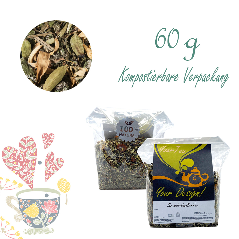Melisse, Orangenblüten, süße Brombeerblätter, Himbeerblätter, Süßholzwurzel, Kardamomschoten, Fenchel, Anis