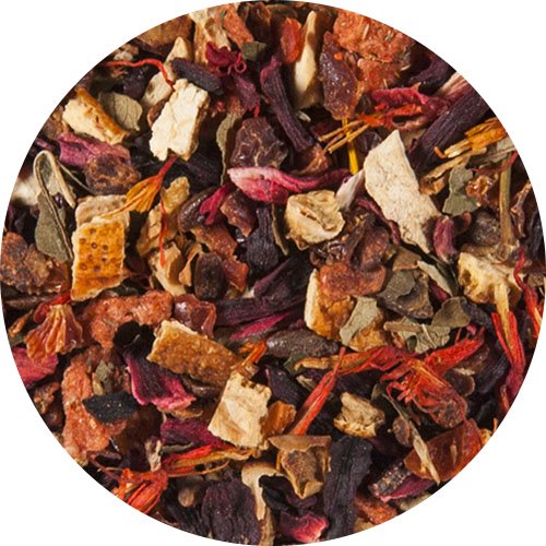 Hibiskusblüten, Hagebuttenschalen, Orangenschalen, Apfeltrester, Aromen, süße Brombeerblätter, Erdbeerfruchtgranulat (Glukosesirup, Erdbeeren, Fruktose, modifizierte Stärke, Verdickungsmittel E401) (5 %), Säuerungsmittel: Citronensäure, Färberdistelblüten
