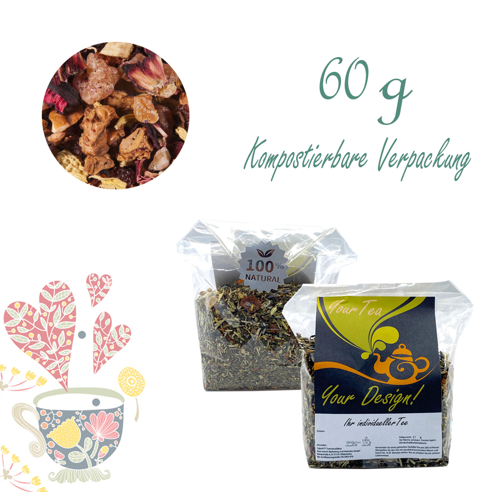 Hibiskusblüten, Papayastücke (Papaya, Zucker), Hagebuttenschalen, Apfelstücke, Hagebuttenkerne, Orangenschalen, Ananaswürfel (Ananas, Zucker) (7 %), Aromen, Kornblumenblüten, Rosenblütenblätter, Sonnenblumenblüten