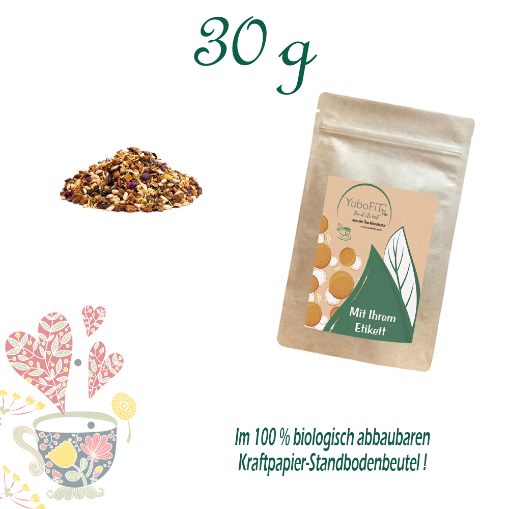 Apfelstücke, Sultaninen, Kakaoschalen (8%), Orangenschalen, Vollkorn-Puffreis, weißer Hibiskus, süße Brombeerblätter, natürliches Aroma, Aroma, Rosenblütenblätter, Säuerungsmittel: Weinsäure, Ringelblumenblüten, Kornblumenblüten, natürliches Tonkabohnen-Aroma mit anderen natürlichen Aromen.