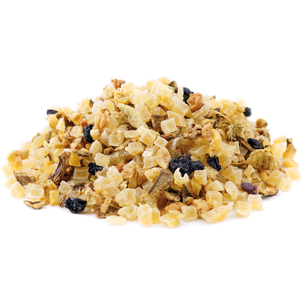 Ananasstücke (Ananas, Zucker, Säuerungsmittel: Zitronensäure), Zitronengranulat (Glukosesirup, Zitronensaftkonzentrat, gezuckerte Aprikosen, modifizierte Stärke, Verdickungsmittel: Natriumalginat, natürliches Aroma), Zitronenschalen, Kiwistücke (5%), Schwarze Johannisbeeren, Apfelstücke, Aroma, Stachelbeerenstücke (3%), natürliches Aroma, Säuerungsmittel: Weinsäure.