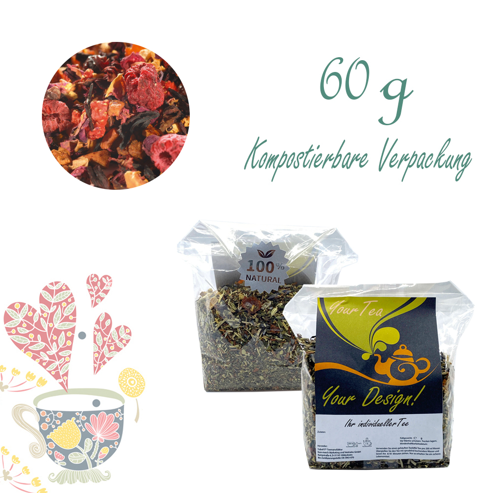 Apfelstücke, Hibiskusblüten, Korinthen, Orangenschalen, Hagebuttenschalen, Aroma, Rosenblütenblätter, Ananasstücke (Ananas, Zucker, Säuerungsmittel: Zitronensäure), Papayastücke (Papaya, Zucker), Erdbeerstücke, Himbeeren (1,5%), natürliches Aroma.