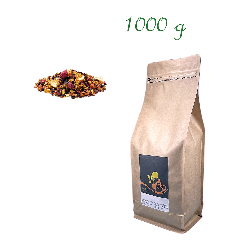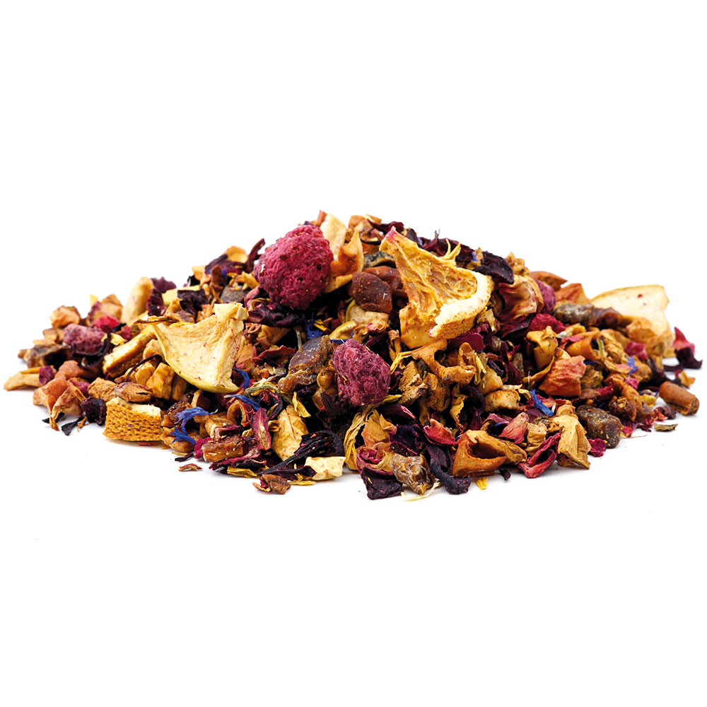 Apfelstücke, Hibiskusblüten, Dattelstücke, Himbeeren (5%), Rote-Bete-Stücke, geviertelte Apfelscheiben, Orangenecken, Birnenstücke, Aroma, Rosenblütenblätter, natürliches Aroma, Sonnenblumenblüten, Kornblumenblüten, Säuerungsmittel: Weinsäure.