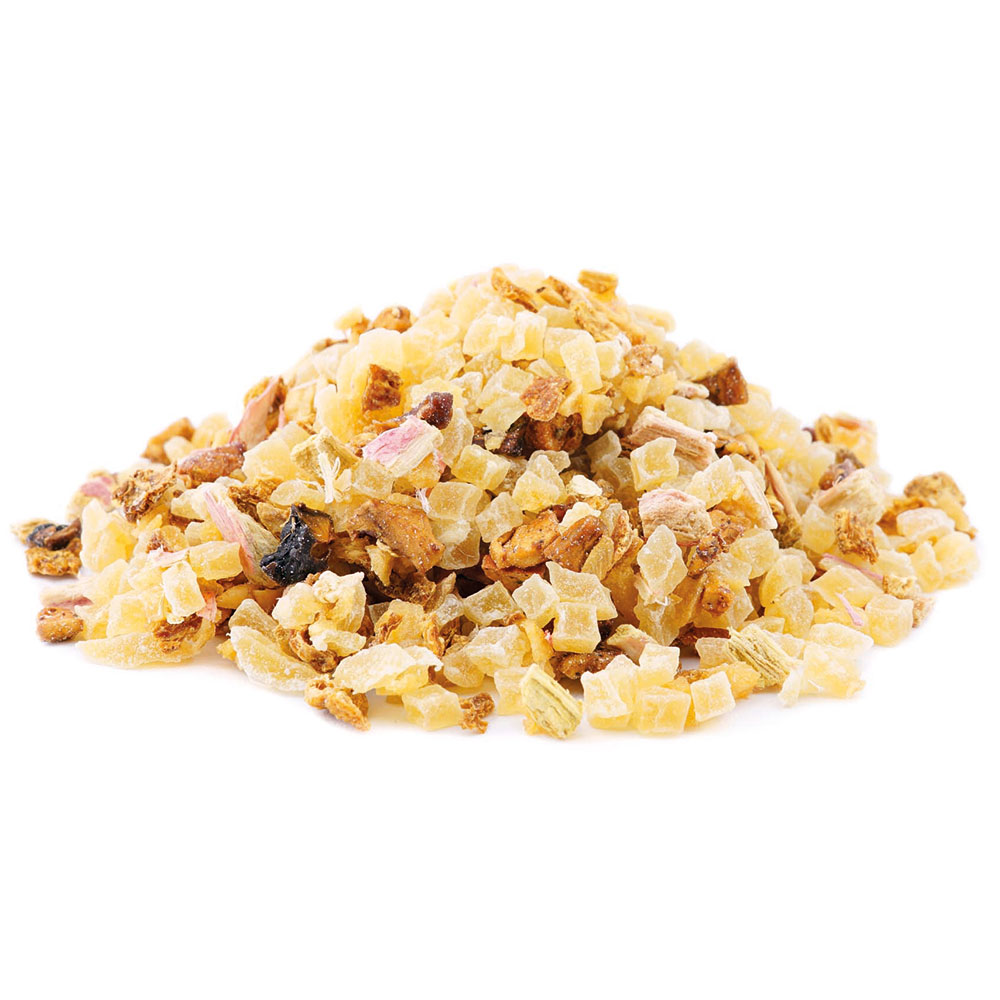 Ananasstücke (Ananas, Zucker, Säuerungsmittel: Zitronensäure), Zitronenschalen (10%), Apfelstücke, Zitronengranulat (8%) (Glukosesirup, Zitronensaftkonzentrat, gezuckerte Aprikosen, modifizierte Stärke, Verdickungsmittel: Natriumalginat, natürliches Aroma), Aroma, Rhabarberstücke (1%), Säuerungsmittel: Weinsäure, natürliches Aroma.
