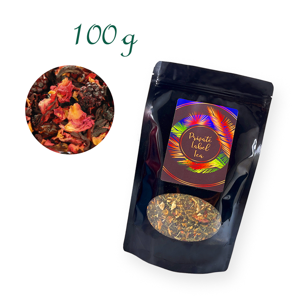 Hibiskusblüten, Korinthen, Holunderbeeren, Attichbeeren, Aroma, Rosenblütenblätter, Schwarze Johannisbeeren, natürliches Aroma, Brombeeren, Heidelbeeren (Heidelbeeren, Zucker).