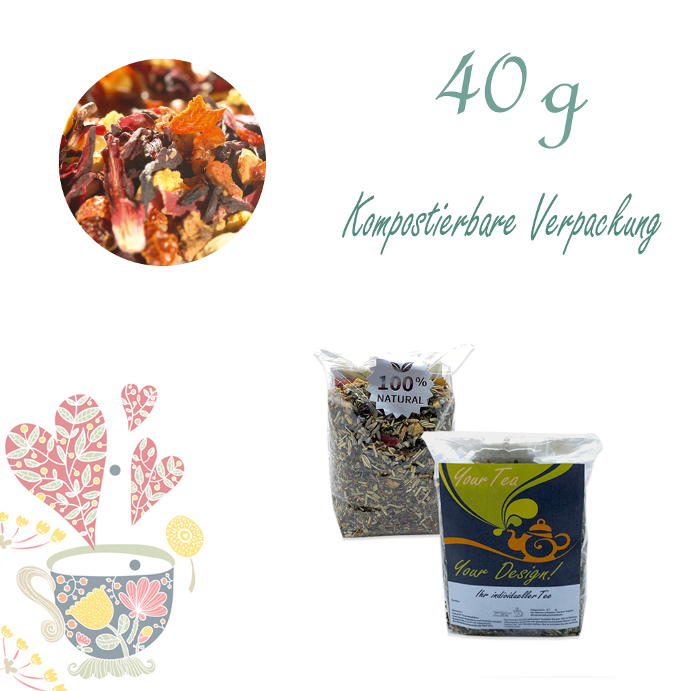 Hibiskusblüten, Apfelstücke, Ananasstücke (Ananas, Zucker, Säuerungsmittel: Zitronensäure), Hagebuttenschalen, Papayastücke (Papaya, Zucker), Orangenschalen (5%), Aroma, Maracujagranulat (2%) (Glukosesirup, Maracujasaftkonzentrat, Aprikosenpulpe, modifizierte Stärke, Verdickungsmittel: Natriumalginat), Orangengranulat (2%) (Orangensaftkonzentrat, Orangenzellen).