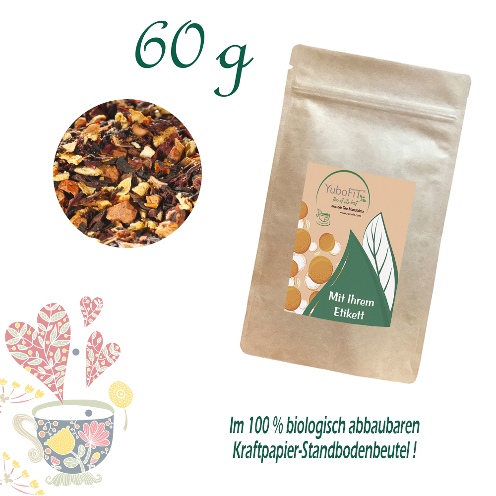 Apfelstücke (42%), Hibiskusblüten (31%), Orangenschalen (10%), Hagebuttenschalen, Zitronenschalen (2%), Orangengranulat (1%) (Orangensaftkonzentrat, Orangenzellen), Zitronengranulat (1%) (Glukosesirup, Zitronensaftkonzentrat, gezuckerte Aprikosen, modifizierte Stärke, Verdickungsmittel: Natriumalginat, natürliches Aroma), natürliches Orangen-Aroma, natürliches Aroma.