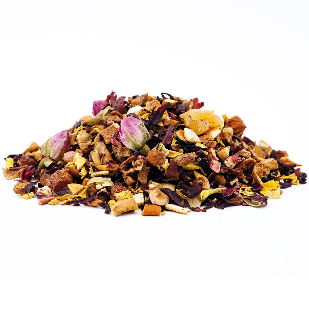 Apfelstücke, Hibiskusblüten, Mangostücke (Mango, Zucker, Säuerungsmittel: Zitronensäure), Orangenschalen, Hagebuttenschalen, Rosenknospen, Aroma, Sonnenblumenblüten.