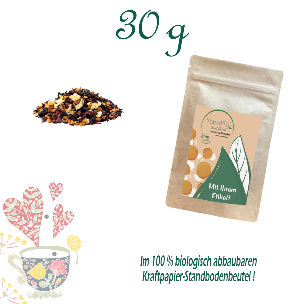 Apfelstücke, Hibiskusblüten, Korinthen, Ananasstücke (15%) (Ananas, Zucker, Säuerungsmittel: Zitronensäure), Bananenchips (Bananen, Kokosnussöl, Rohrzucker, natürliches Bananenaroma), Aroma.