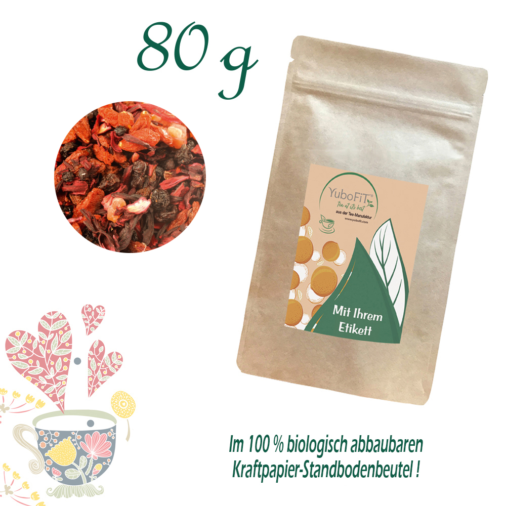 Hibiskusblüten, Korinthen, Attichbeeren, Gojibeeren (10%), Papayastücke (Papaya, Zucker), Holunderbeeren, Aroma.