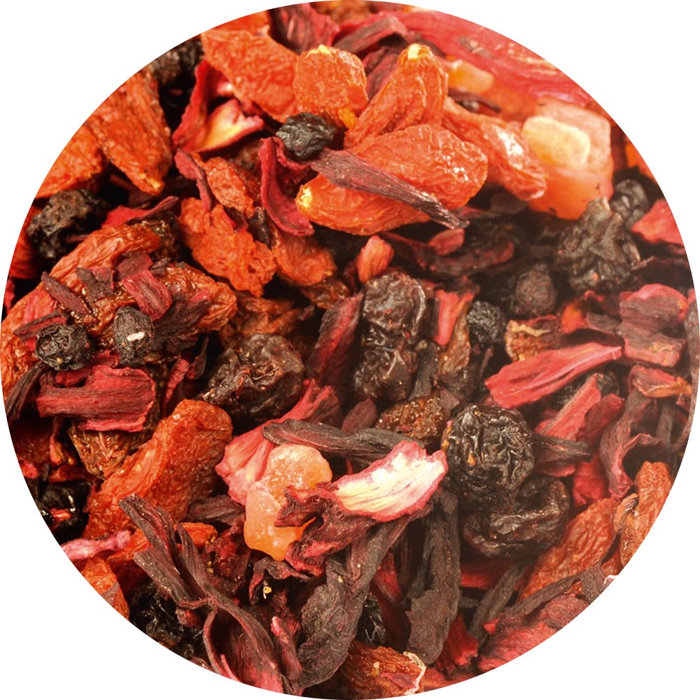 Hibiskusblüten, Korinthen, Attichbeeren, Gojibeeren (10%), Papayastücke (Papaya, Zucker), Holunderbeeren, Aroma.
