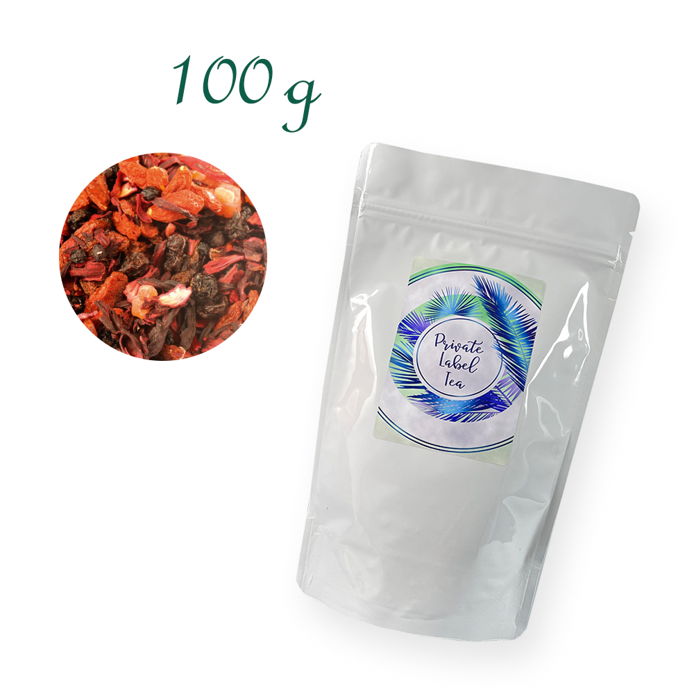 Hibiskusblüten, Korinthen, Attichbeeren, Gojibeeren (10%), Papayastücke (Papaya, Zucker), Holunderbeeren, Aroma.