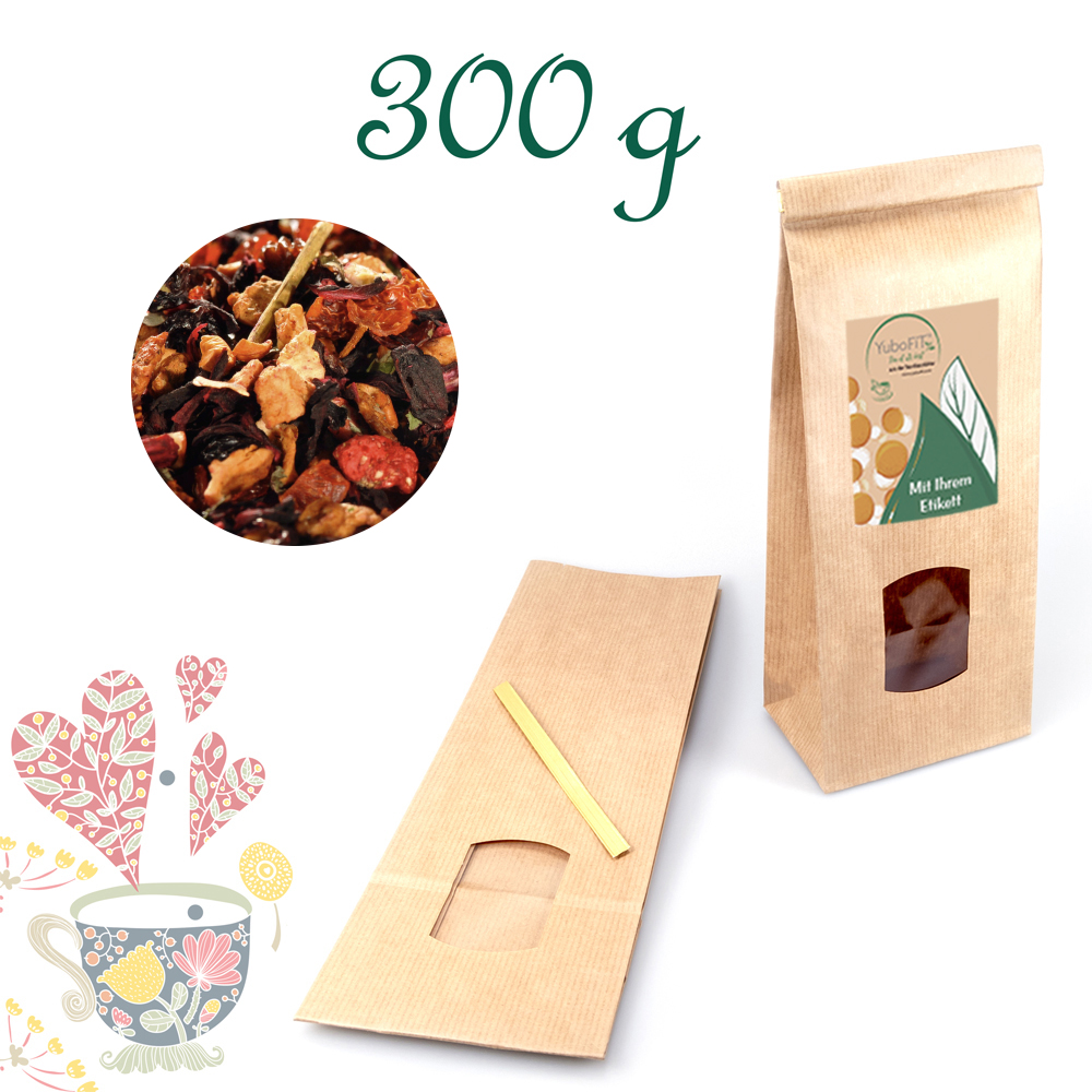Hibiskusblüten, Hagebuttenschalen, Apfelstücke, Sultaninen, Korinthen, Aroma, Brombeerblätter, Erdbeerstücke, Himbeerstücke, Brombeeren.
