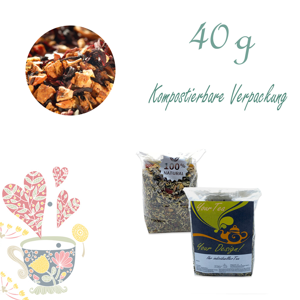 Apfelstücke, Hibiskusblüten, Orangenschalen, Hagebuttenschalen, Ananasstücke (6%) (Ananas, Zucker, Säuerungsmittel: Zitronensäure), Aroma, Kokosnussflocken (3%).