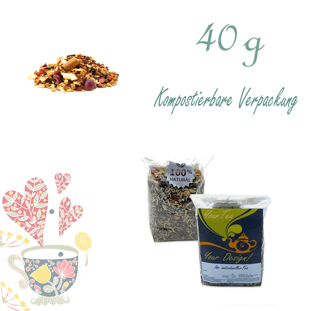 Apfelstücke (33%), Ingwer, Hagebuttenschalen, Zimtstangen, geviertelte Apfelscheiben (5%), Süßholz, Orangenecken, Aroma, Gewürznelken, Piment, Cranberries, natürliches Aroma. Enthält Süßholz – bei hohem Blutdruck sollte ein übermäßiger Verzehr dieses Erzeugnisses vermieden werden.