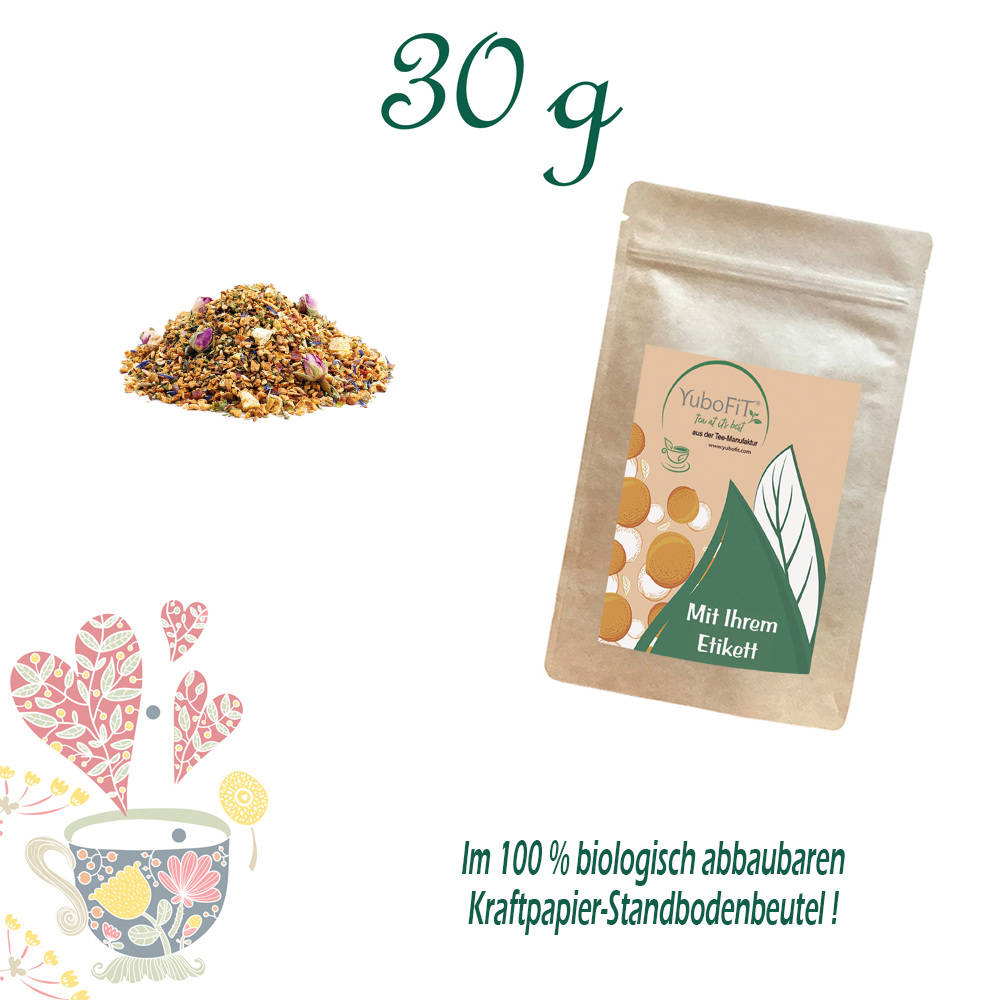 Apfelstücke, Moringablätter, Hagebuttenschalen, Hibiskusblüten, Kollagenpulver (Rind) (3%), natürliches Aroma, Aroma, Rosenknospen, Pfirsichstücke (1%) (Pfirsiche, Zucker), Litschistücke (1%), Kornblumenblüten.