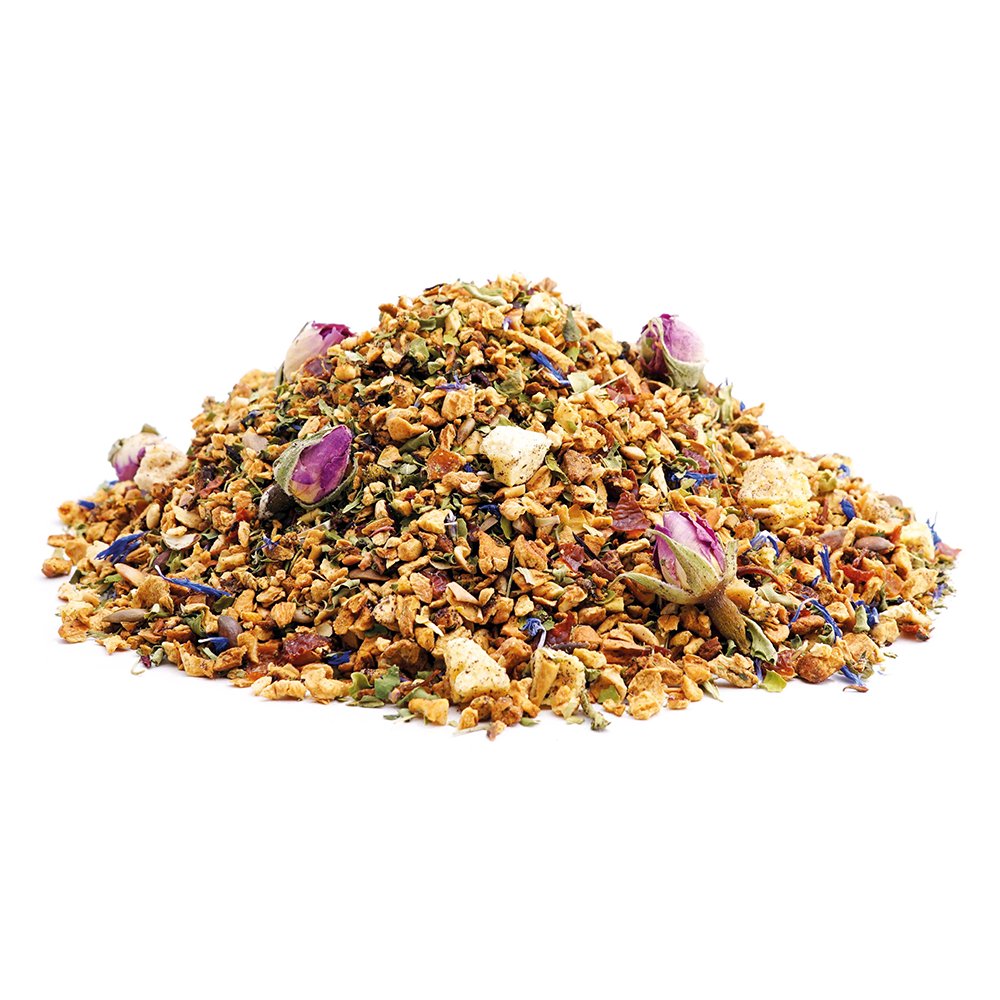 Apfelstücke, Moringablätter, Hagebuttenschalen, Hibiskusblüten, Kollagenpulver (Rind) (3%), natürliches Aroma, Aroma, Rosenknospen, Pfirsichstücke (1%) (Pfirsiche, Zucker), Litschistücke (1%), Kornblumenblüten.