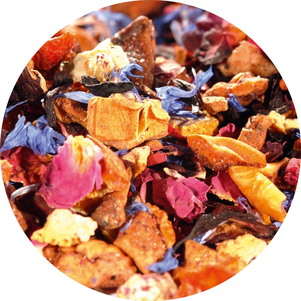 Apfelstücke, Hibiskusblüten, Orangenschalen, Hagebuttenschalen, Rosenblütenblätter (3%), Korinthen, Aroma, Aprikosenstücke (2%), Mangostücke (Mango, Zucker, Säuerungsmittel: Zitronensäure), Kornblumenblüten.