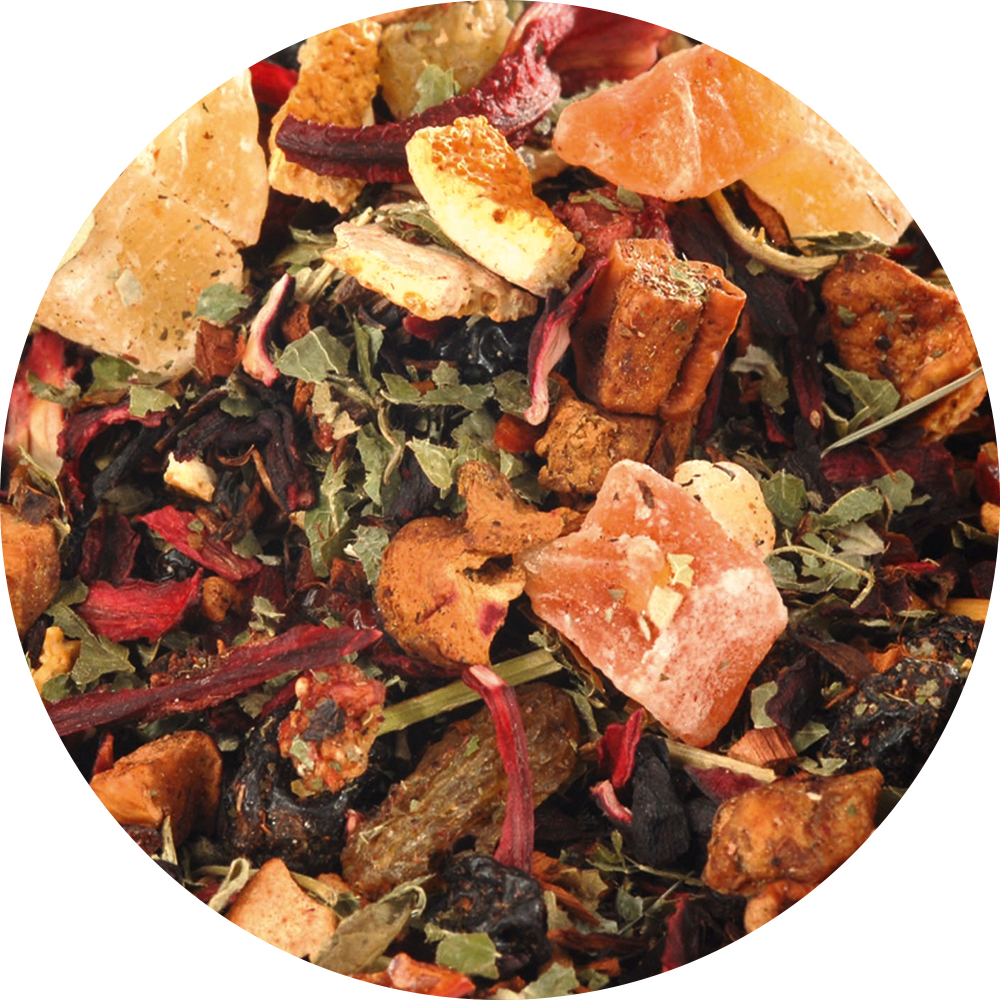 Apfelstücke, Hibiskusblüten, Honigbuschtee, Korinthen, Sultaninen, Ananasstücke (7%) (Ananas, Zucker, Säuerungsmittel: Zitronensäure), Mangostücke (7%) (Mango, Zucker, Säuerungsmittel: Zitronensäure), Papayastücke (7%) (Papaya, Zucker), Hagebuttenschalen, Orangenschalen, Brombeerblätter, Aroma, Erdbeerstücke, Rote Johannisbeeren.