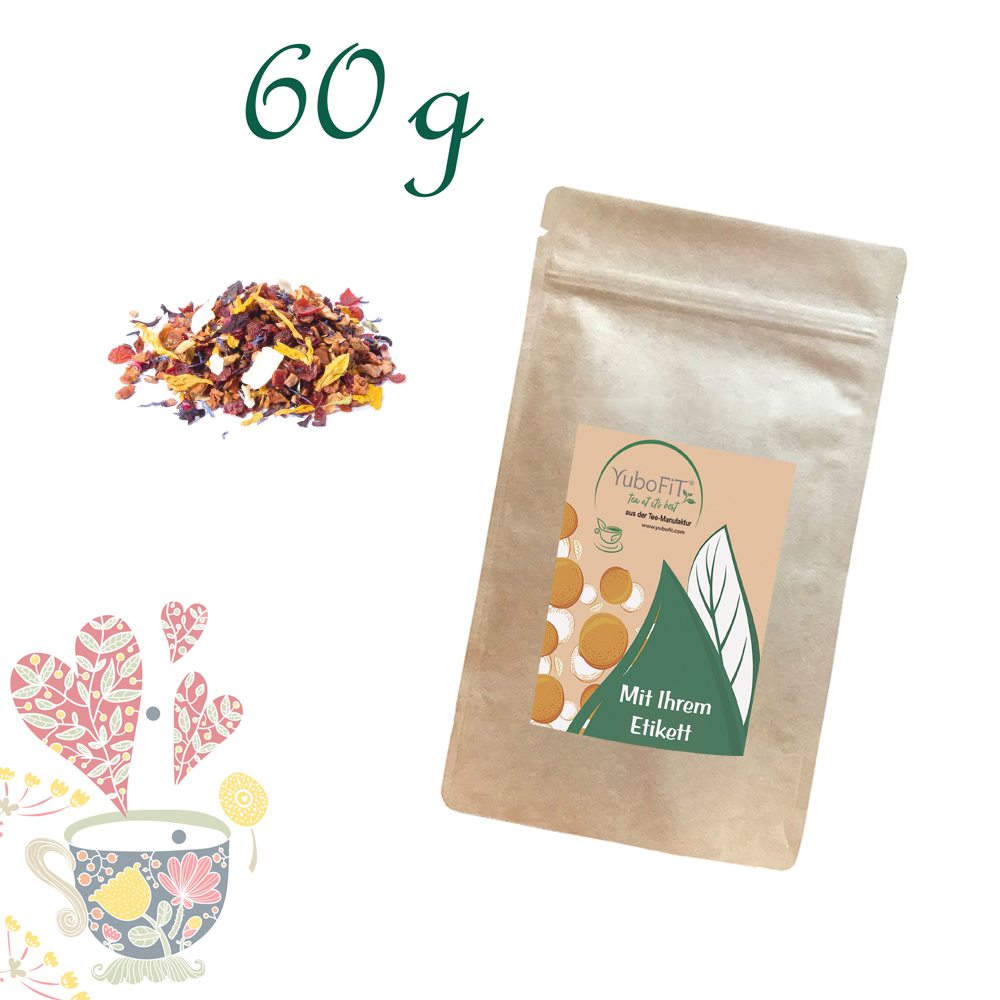 Apfelstücke (50%), Hagebuttenschalen, Hibiskusblüten, Kokosnusschips, Aroma, Sonnenblumenblüten, Kornblumenblüten.