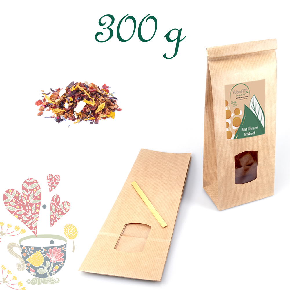 Apfelstücke (50%), Hagebuttenschalen, Hibiskusblüten, Kokosnusschips, Aroma, Sonnenblumenblüten, Kornblumenblüten.