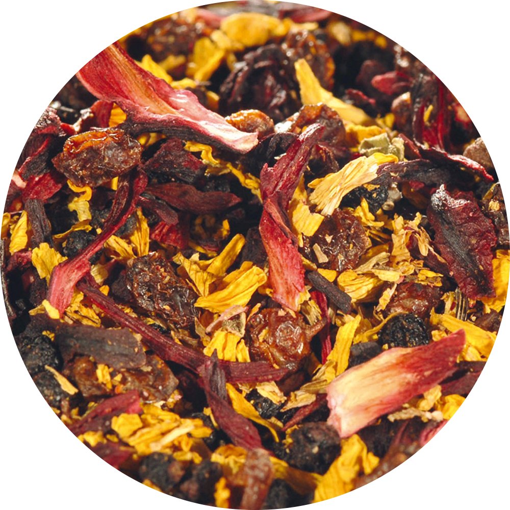 Hibiskusblüten, Sanddornbeeren (23%), Attichbeeren, Holunderbeeren (8%), Aroma, Sonnenblumenblüten.