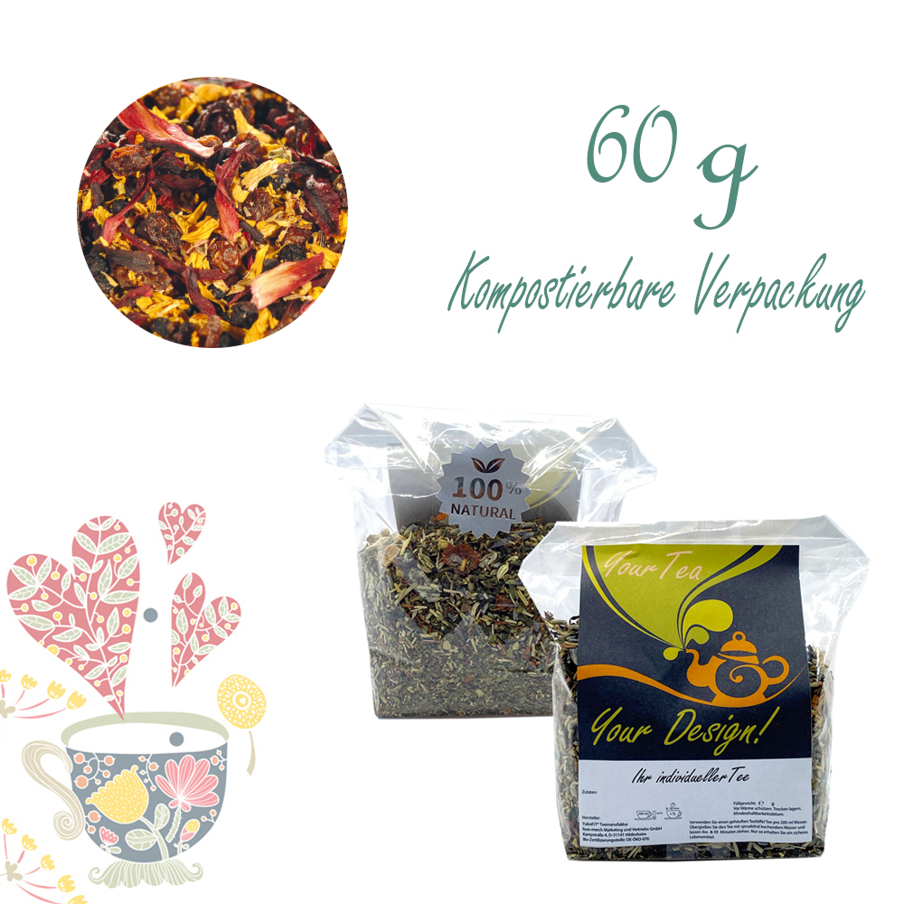 Hibiskusblüten, Sanddornbeeren (23%), Attichbeeren, Holunderbeeren (8%), Aroma, Sonnenblumenblüten.