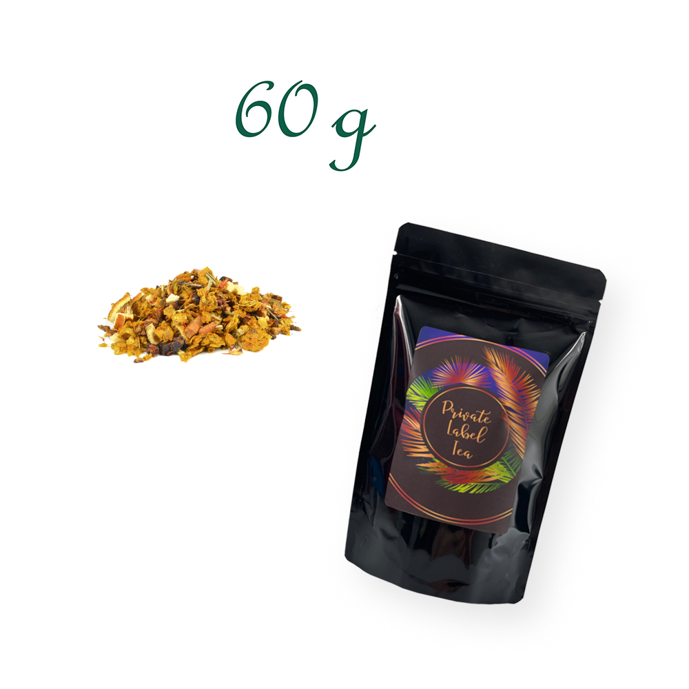 Apfelstücke, Sanddornbeerenschalen (25%), Ananasstücke (Ananas, Zucker, Säuerungsmittel: Zitronensäure), Orangenecken (6%), Aroma, Zitronengras, Säuerungsmittel: Weinsäure, Limettenschalen (2%), natürliches Aroma, Saflorblüten.