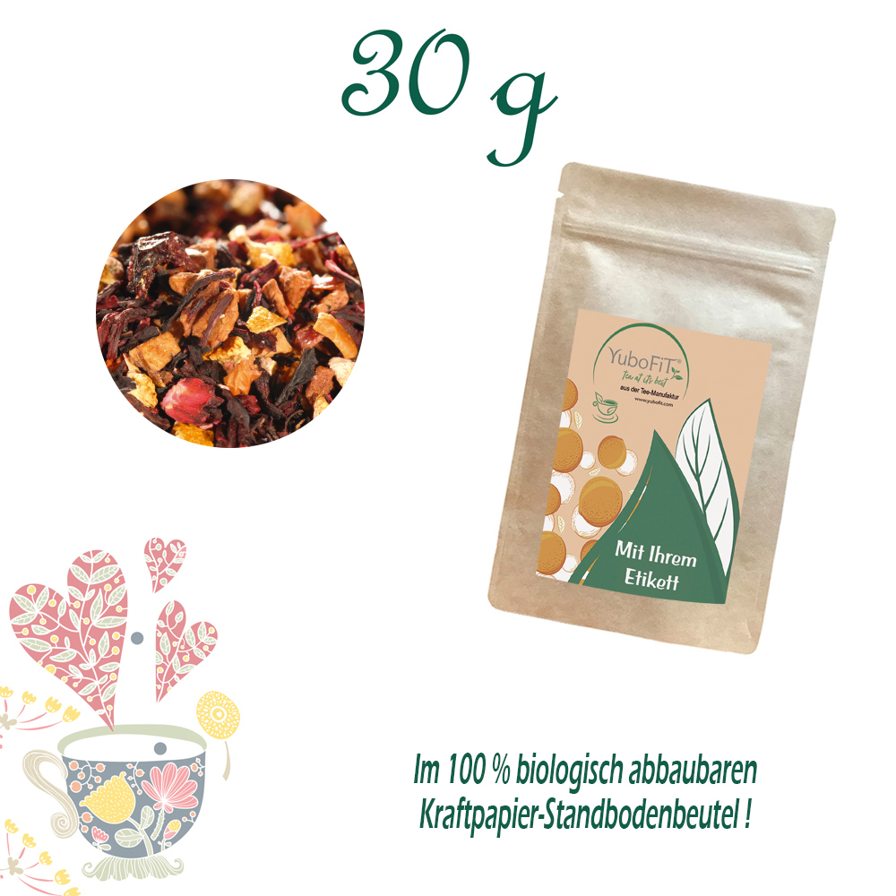 Apfelstücke, Hibiskusblüten, Orangenschalen, Hagebuttenschalen, Aroma, Sauerkirschen (1%).