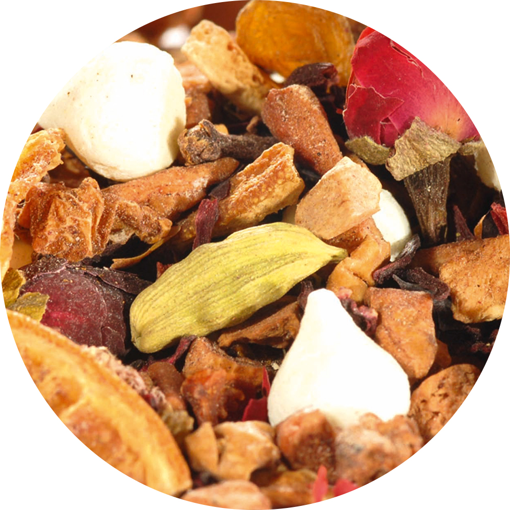 Apfelstücke, Hibiskusblüten, Baiserhütchen (10%) (Zucker, HÜHNEREIWEISSPULVER), Sultaninen, Orangenschalen, Hagebuttenschalen, Rosenknospen, Orangenecken (6%), Kardamom, Gewürznelken, Aroma, natürliches Orangen-Aroma.